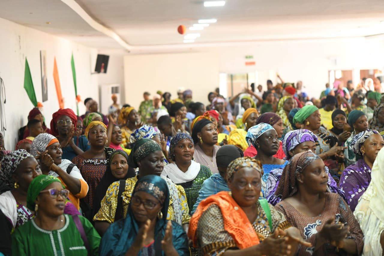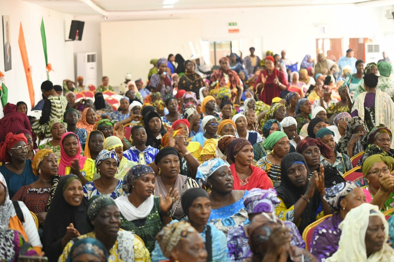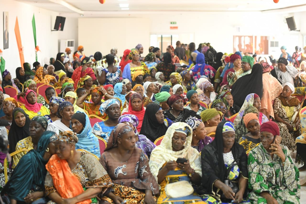 Réunies dans la salle de conférences Alassane Ouattara du siège régional du RHDP, les associations féminines du Réseau des Amis de Bema Fofana ainsi que plusieurs communautés musulmanes ont reçu 1 000 sacs de riz et 400 sacs de sucre.